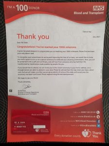 I am delighted to inform you of the achievement of my lifelong ambition. On 7th July 2021,(when England played semifinals ) I carried out my 100th Blood donation. This process has taken me over 42 years. I attach an image of the letter from the Director of Donor Experience NHS Blood and Transplant. I will share an image of the award once I receive it.