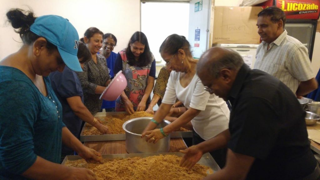 This was all happening while the football was being watched in the hall on the big screen by other members and snacks made by Ushaben and her team. We could hear the AHHHH’s while the ladoos for the Anand Yatra were being prepared. The footie finished with England coming home, but the ladoos continued to be made by the volunteers. In the hall the evening cards team started their playing while in the outside kitchen of the shakti centre the volunteers were busy shaping the ladoos.