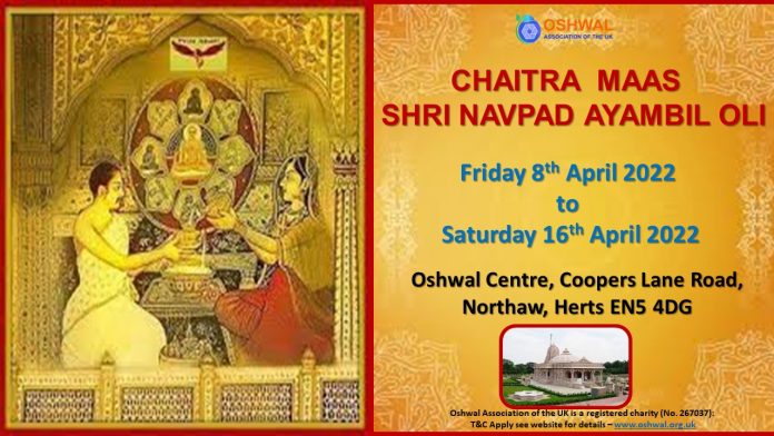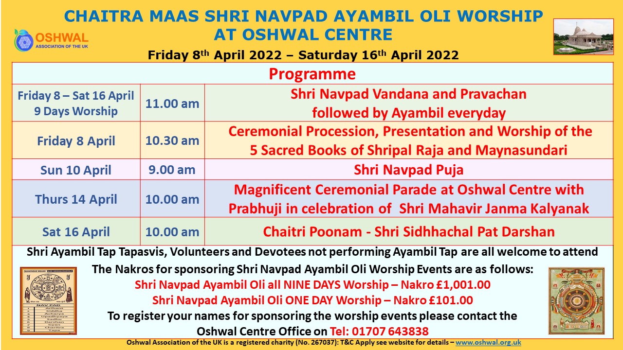 A very warm invitation to you all to join in celebration of the auspicious Shri Navpad Ayambil Oli organised by the Oshwal Association of the U.K. at Oshwal Centre after two years.