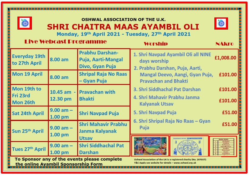 In the current circumstances, Shri Navpad Aymbil Oli will be celebrated online via live webcast with members of all nine areas of the OAUK. Attached is the link to the website and details of the nine day worship. This is an invaluable opportunity to rejuvenate our soul.