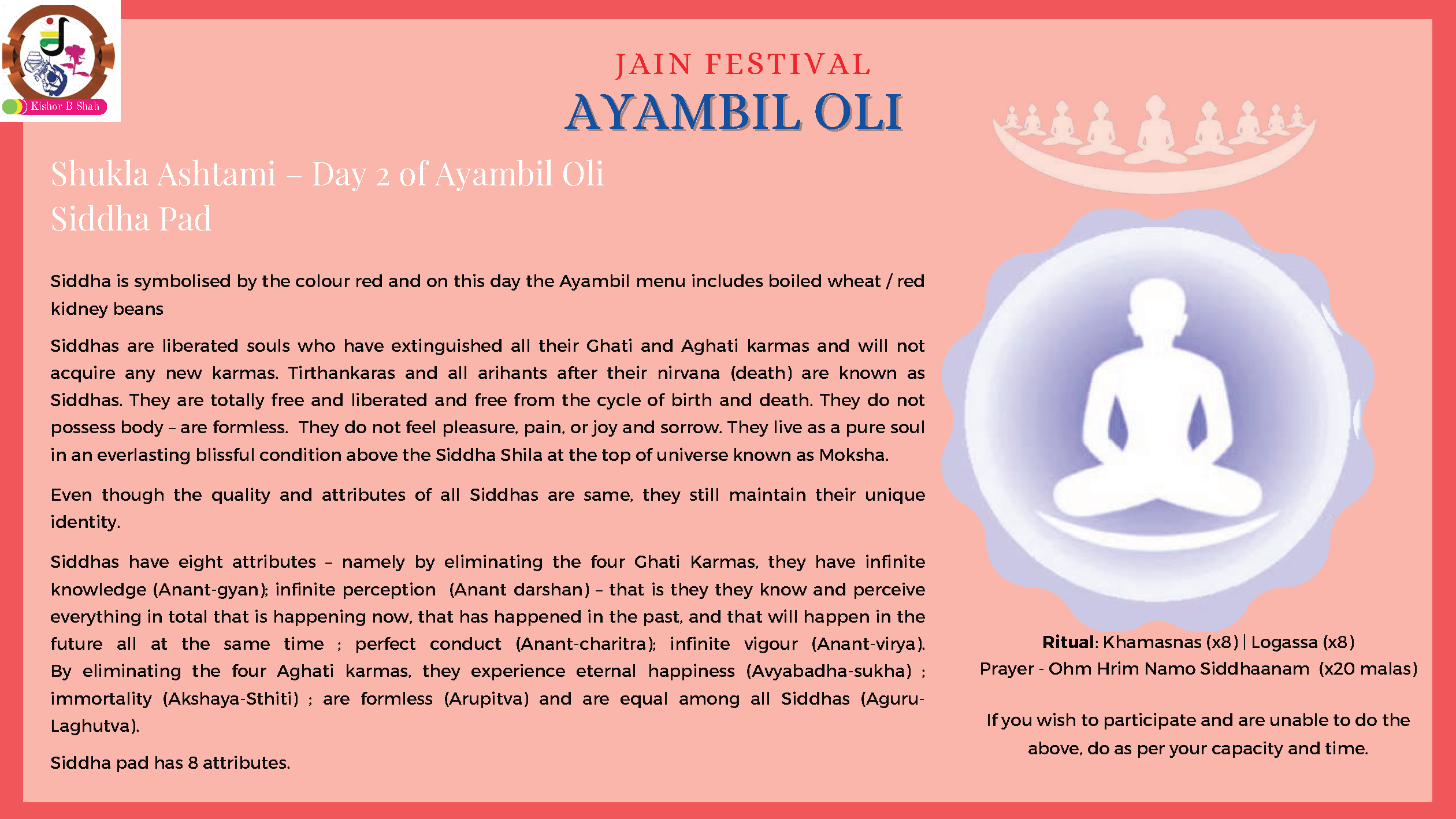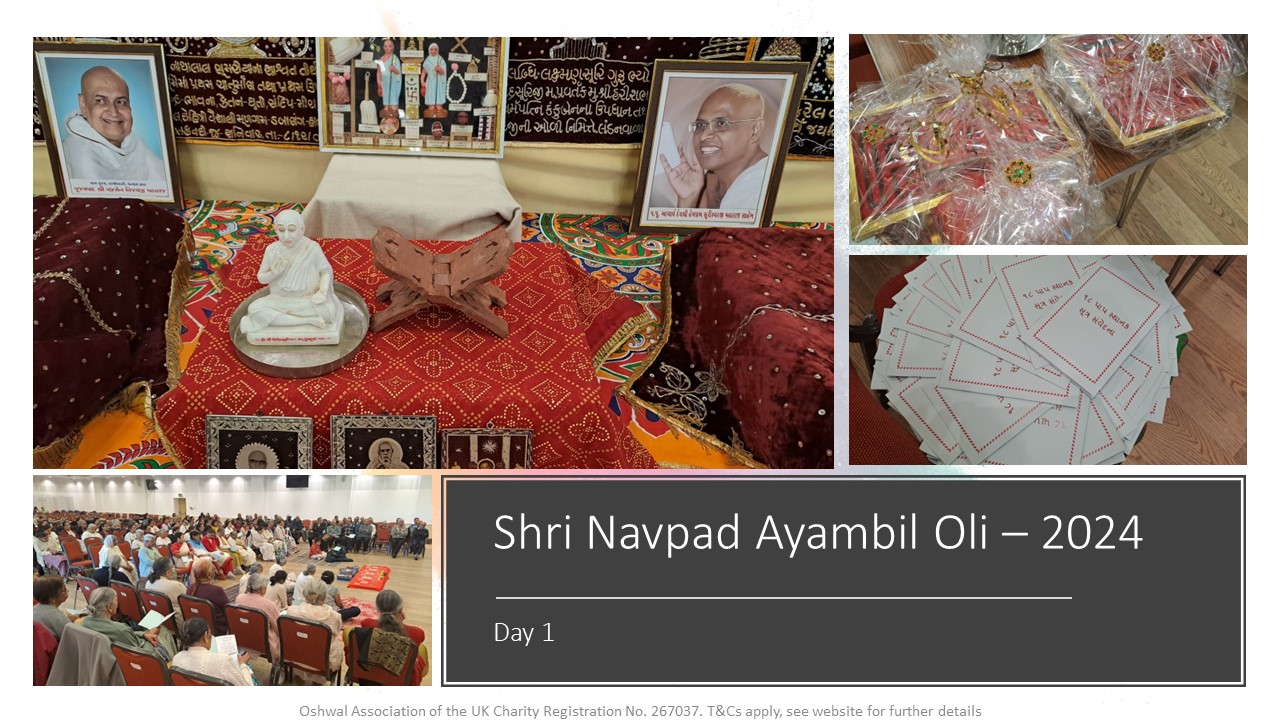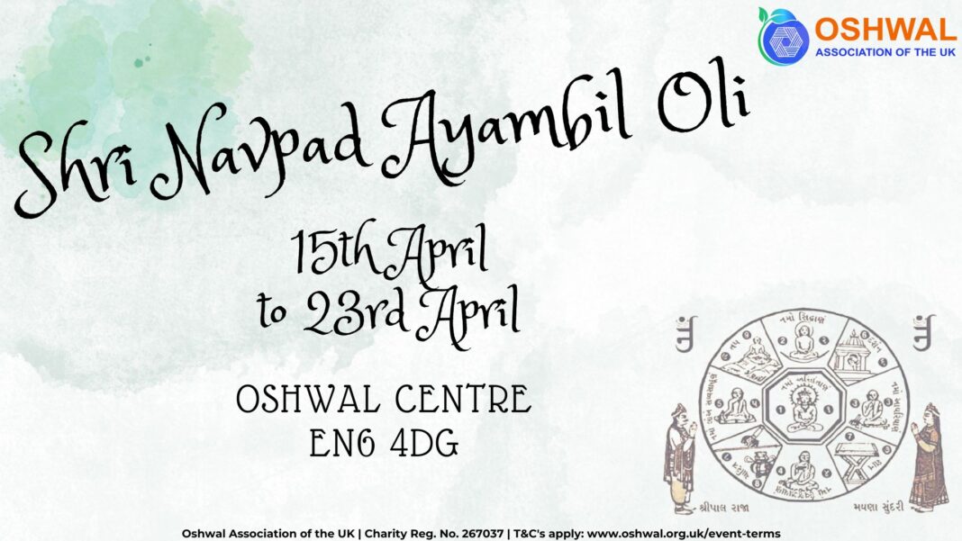 A very warm invitation to you all to join in the auspicious Shri Navpad Ayambil Oli for members of all nine areas, organised by the Oshwal Association of the U.K, beginning Mon, 15th April for 9 days.