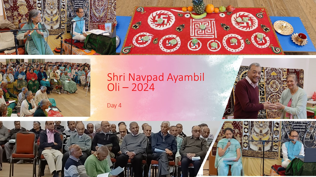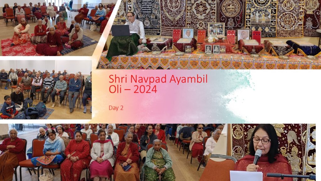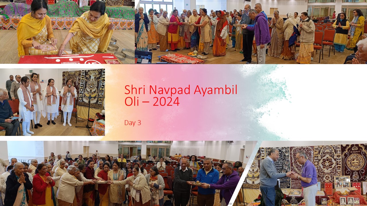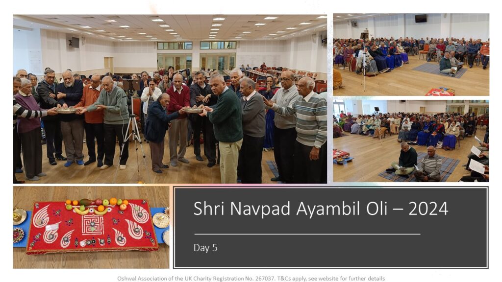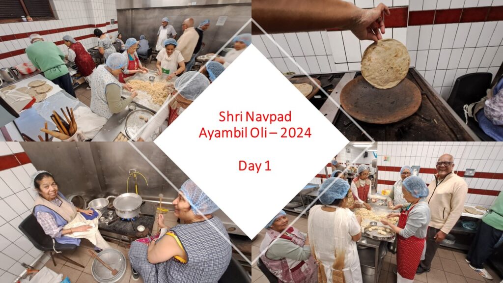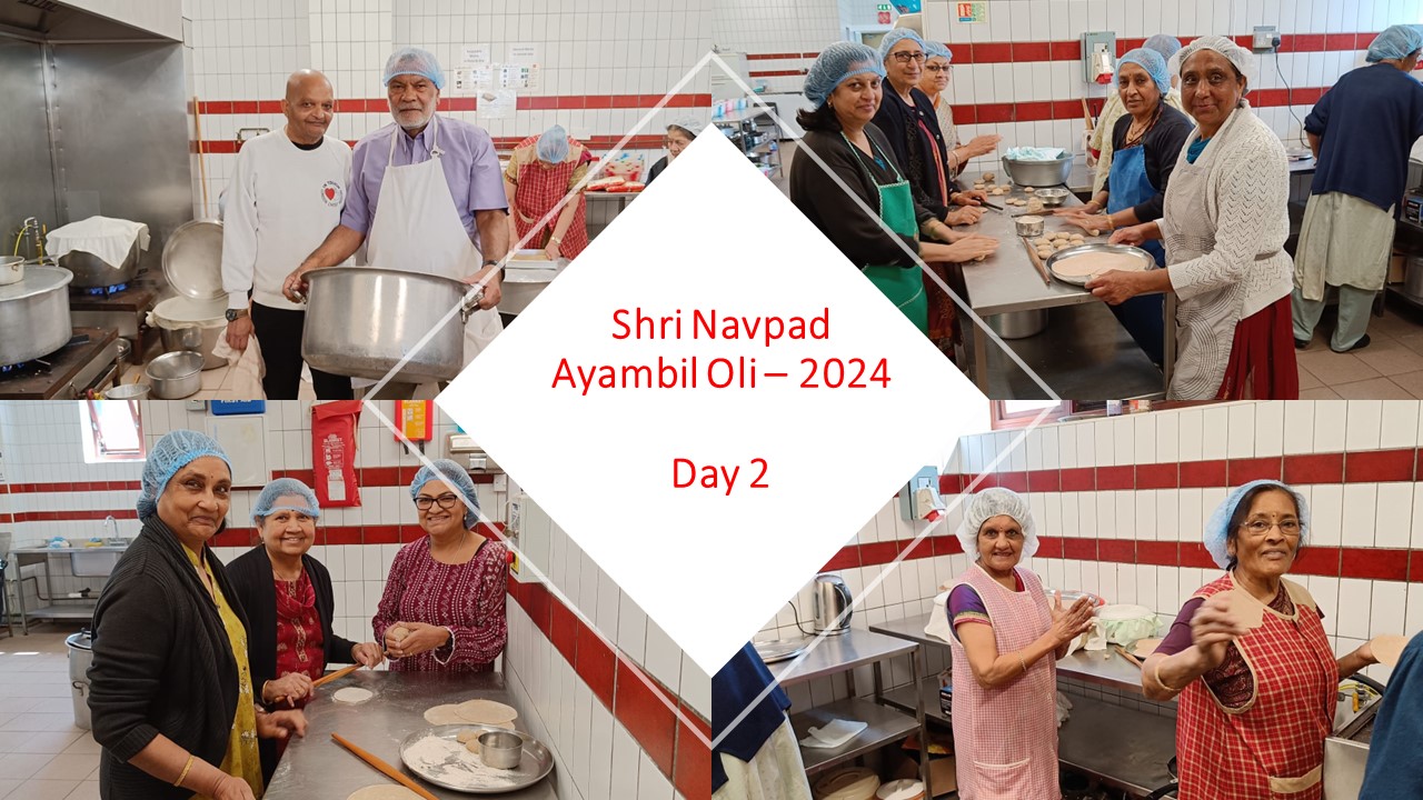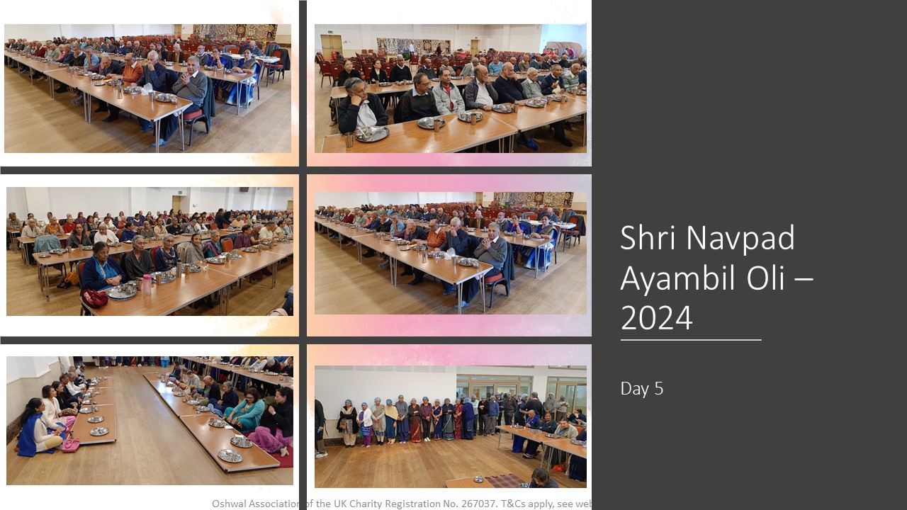 VENUE: Ayambil as always will be taking place at Oshwal Centre each day. There will be vaachan from 11am and thereafter bhojan.
