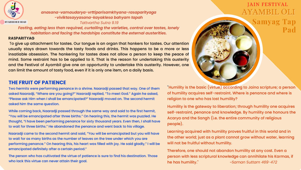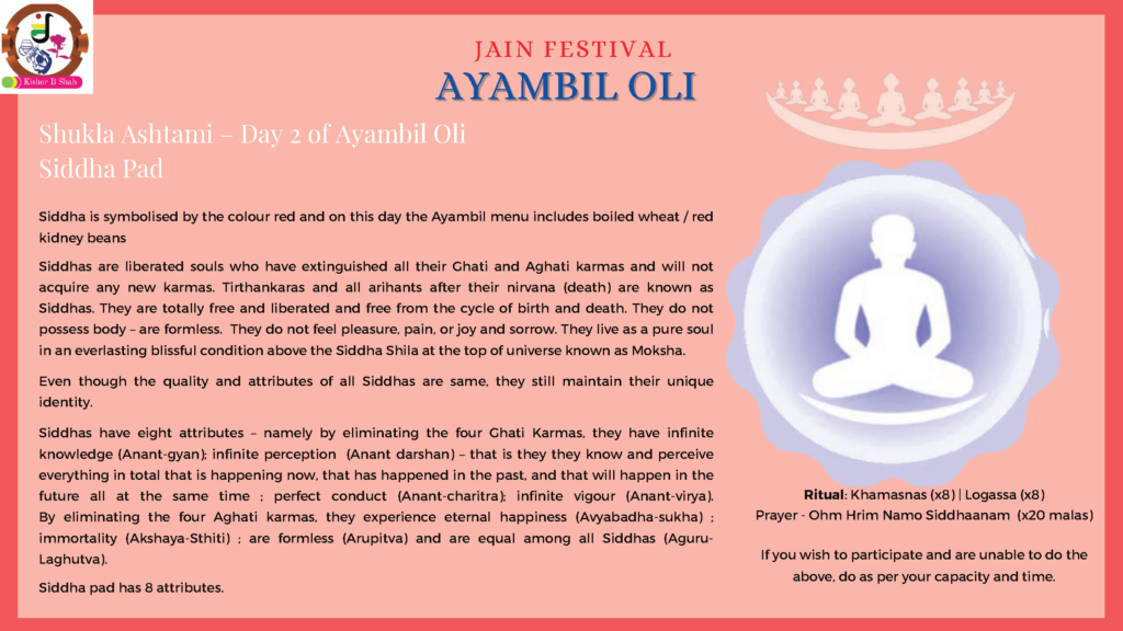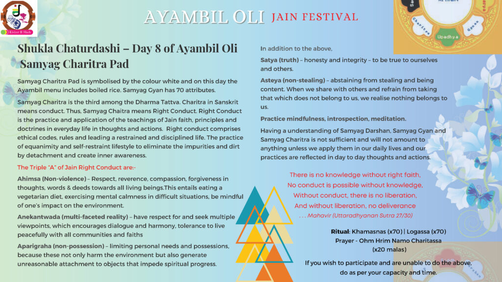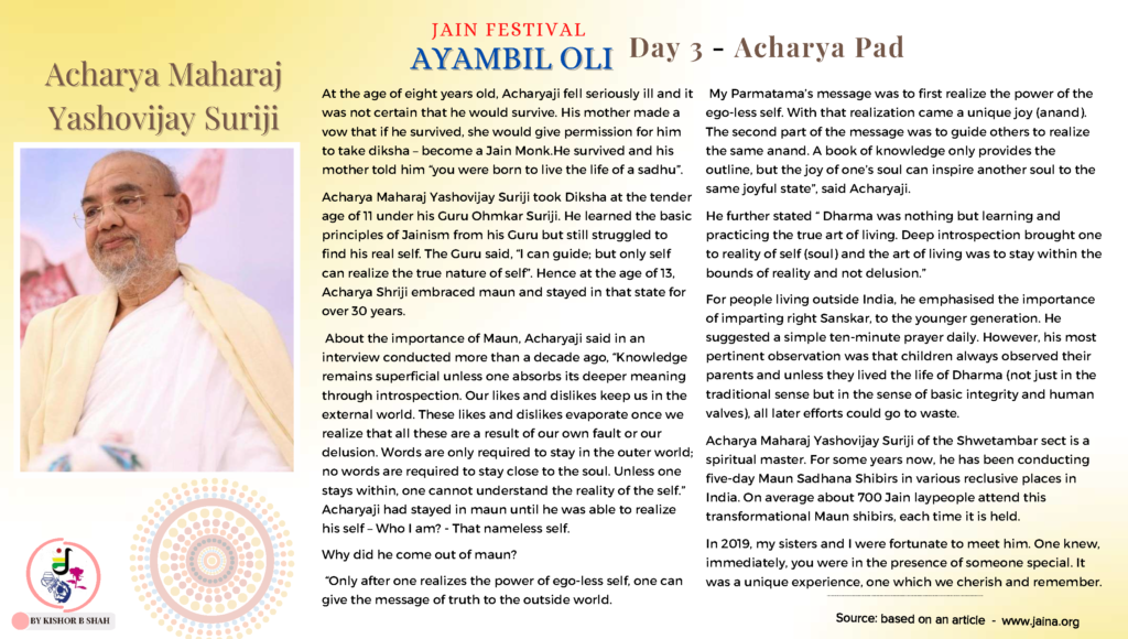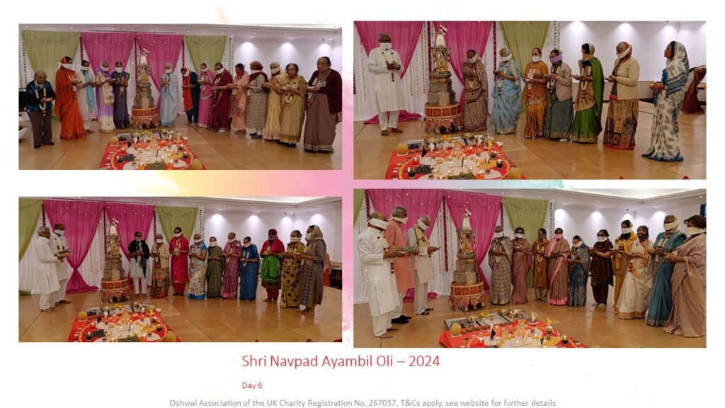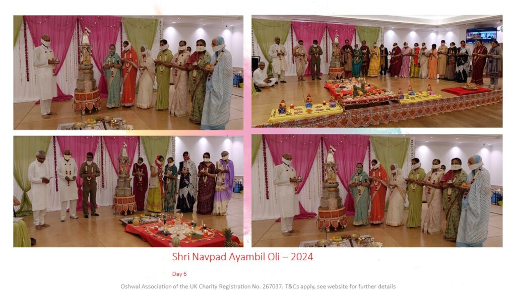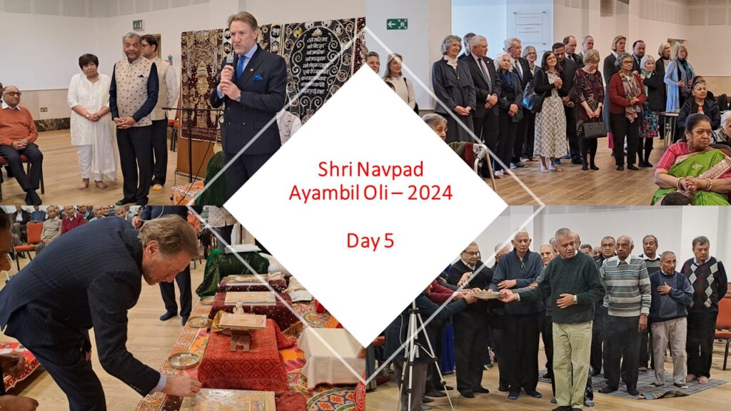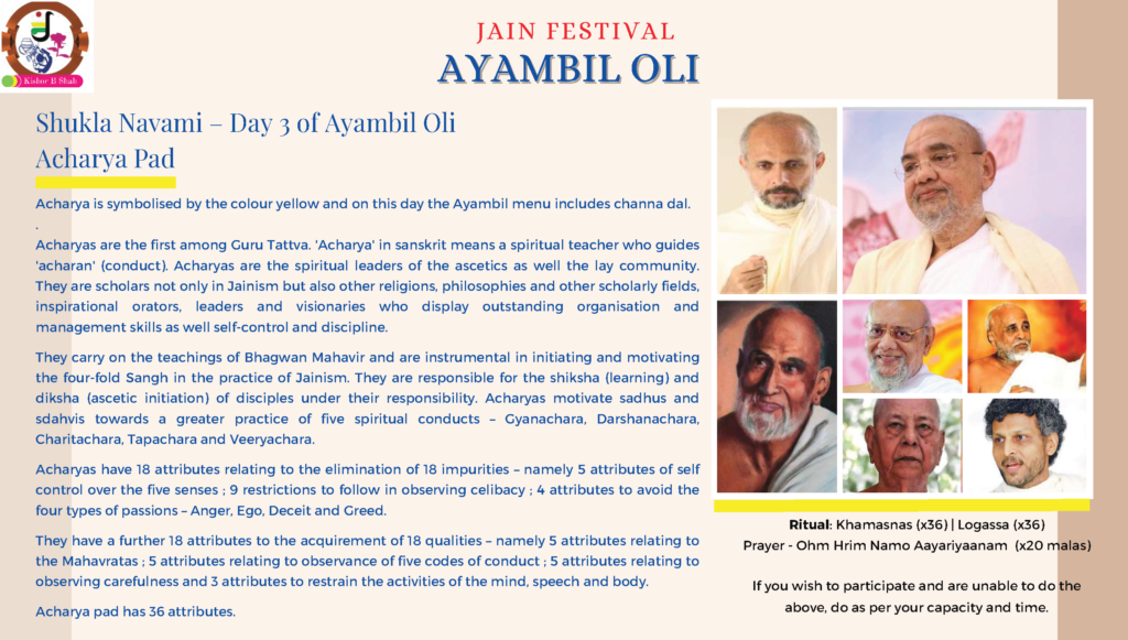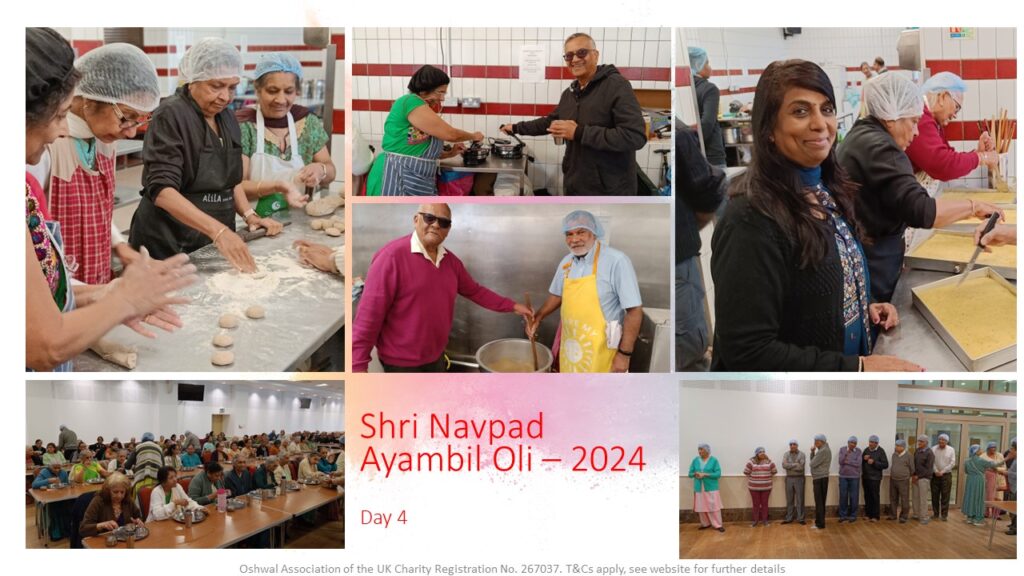 VENUE: Ayambil as always will be taking place at Oshwal Centre each day. There will be vaachan from 11am and thereafter bhojan.