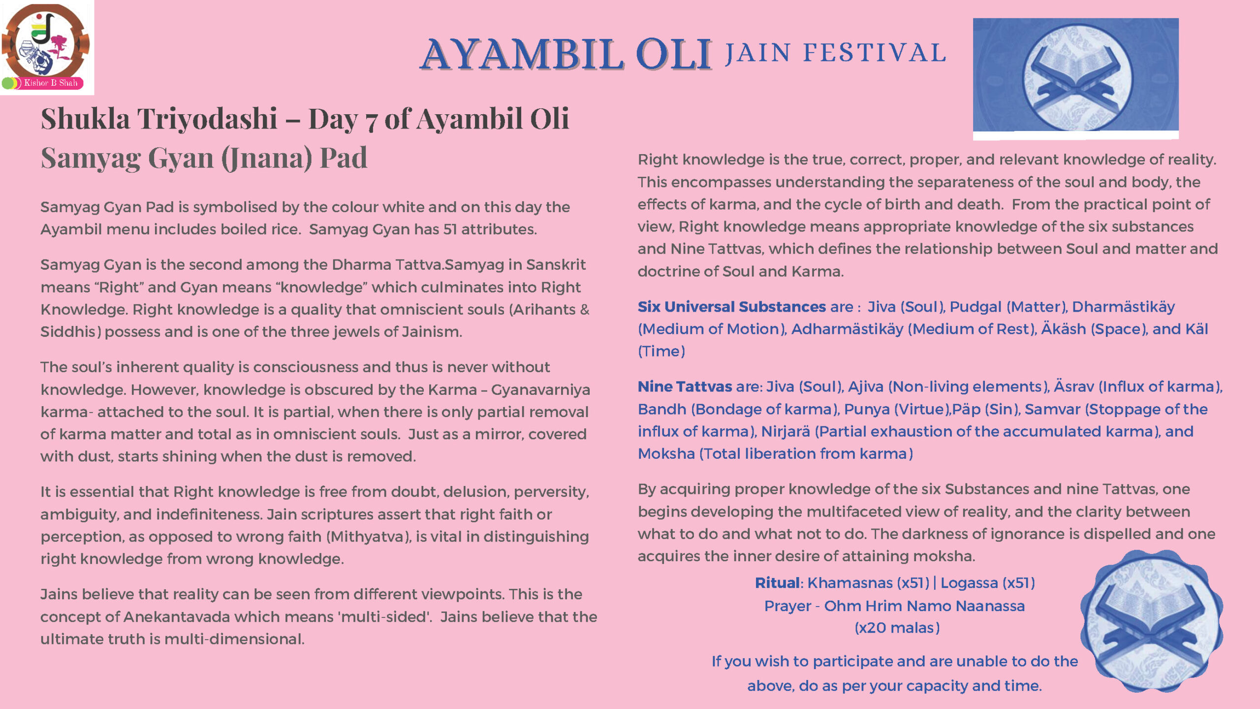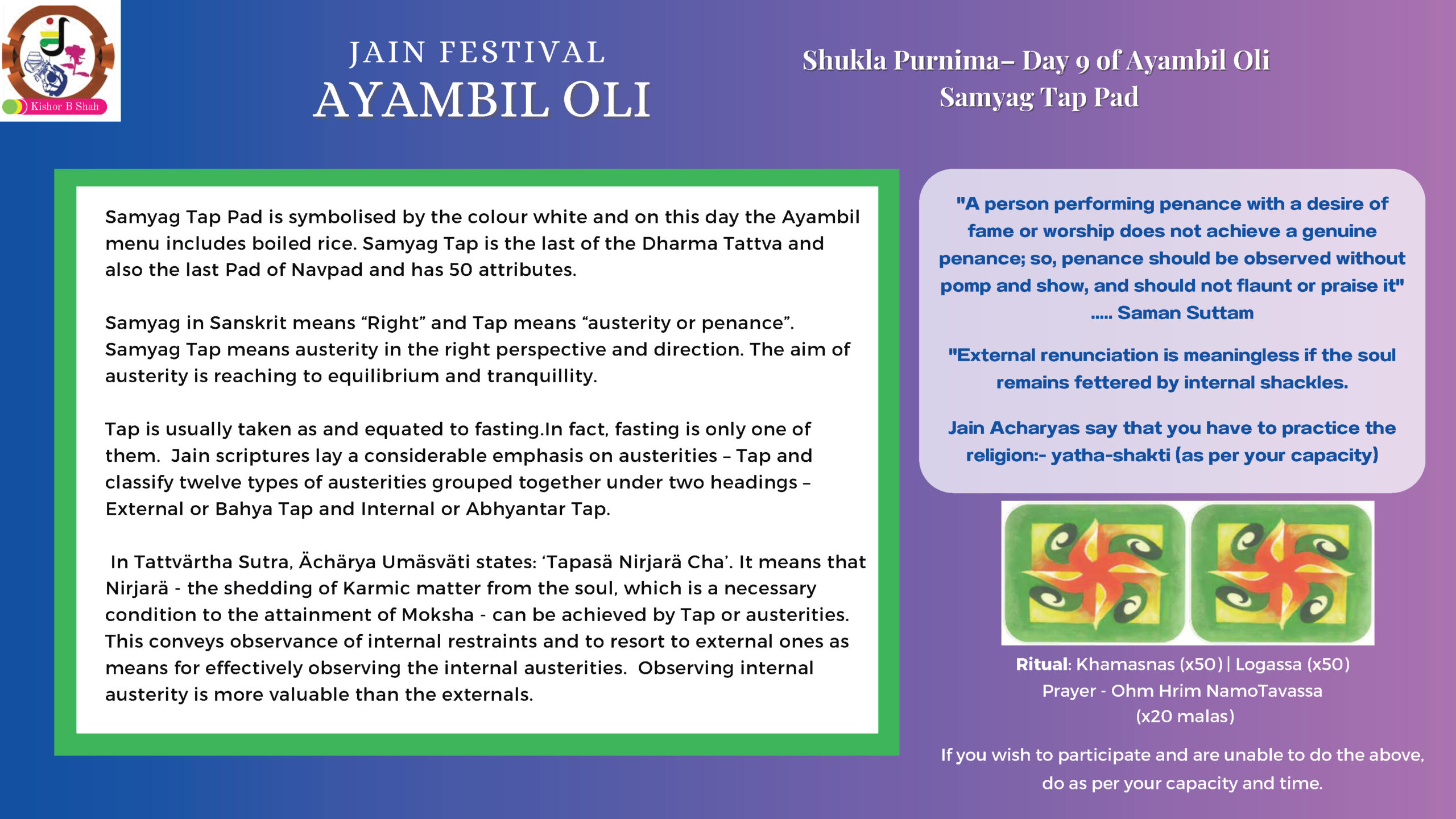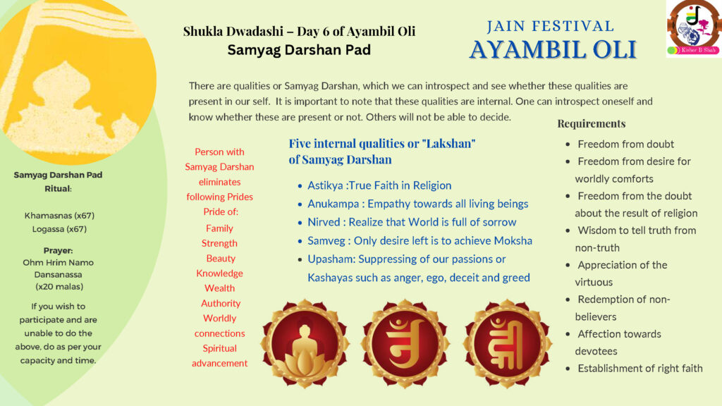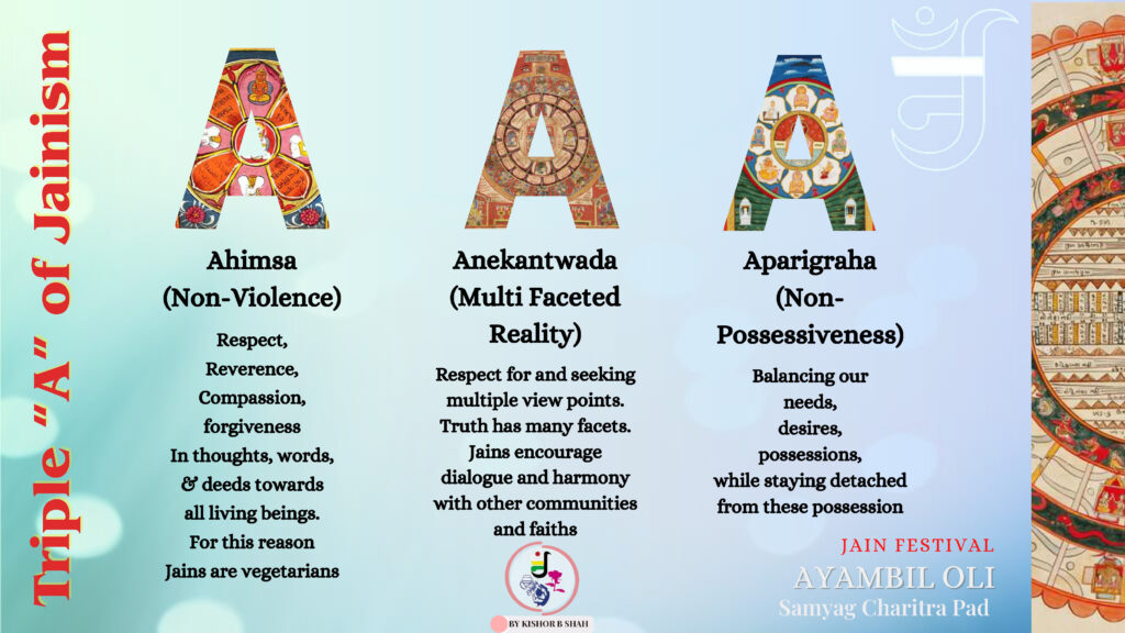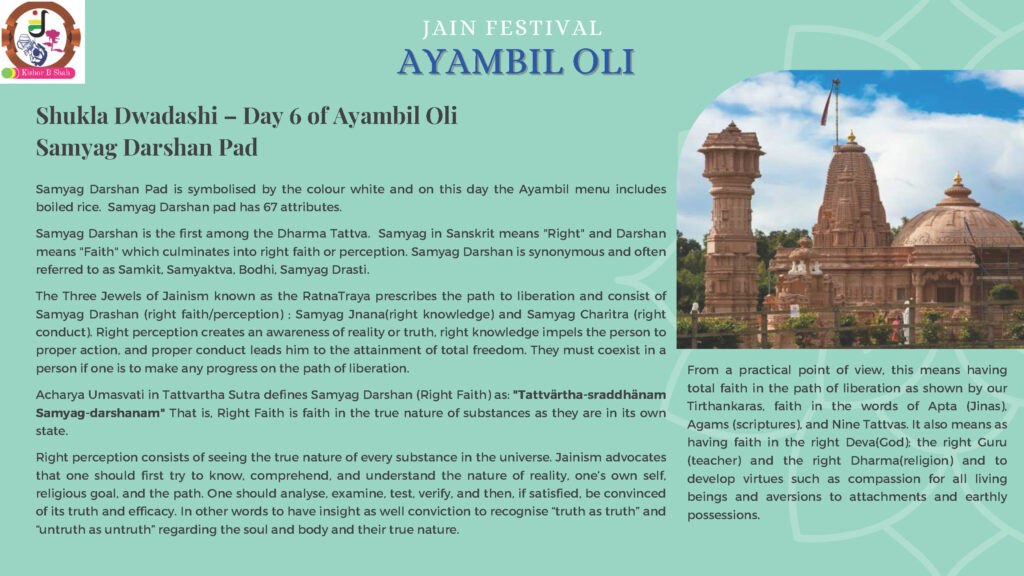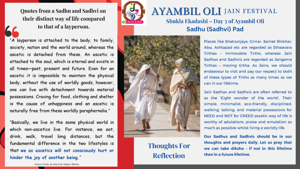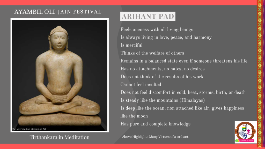 VENUE: Ayambil as always will be taking place at Oshwal Centre each day. There will be vaachan from 11am and thereafter bhojan.