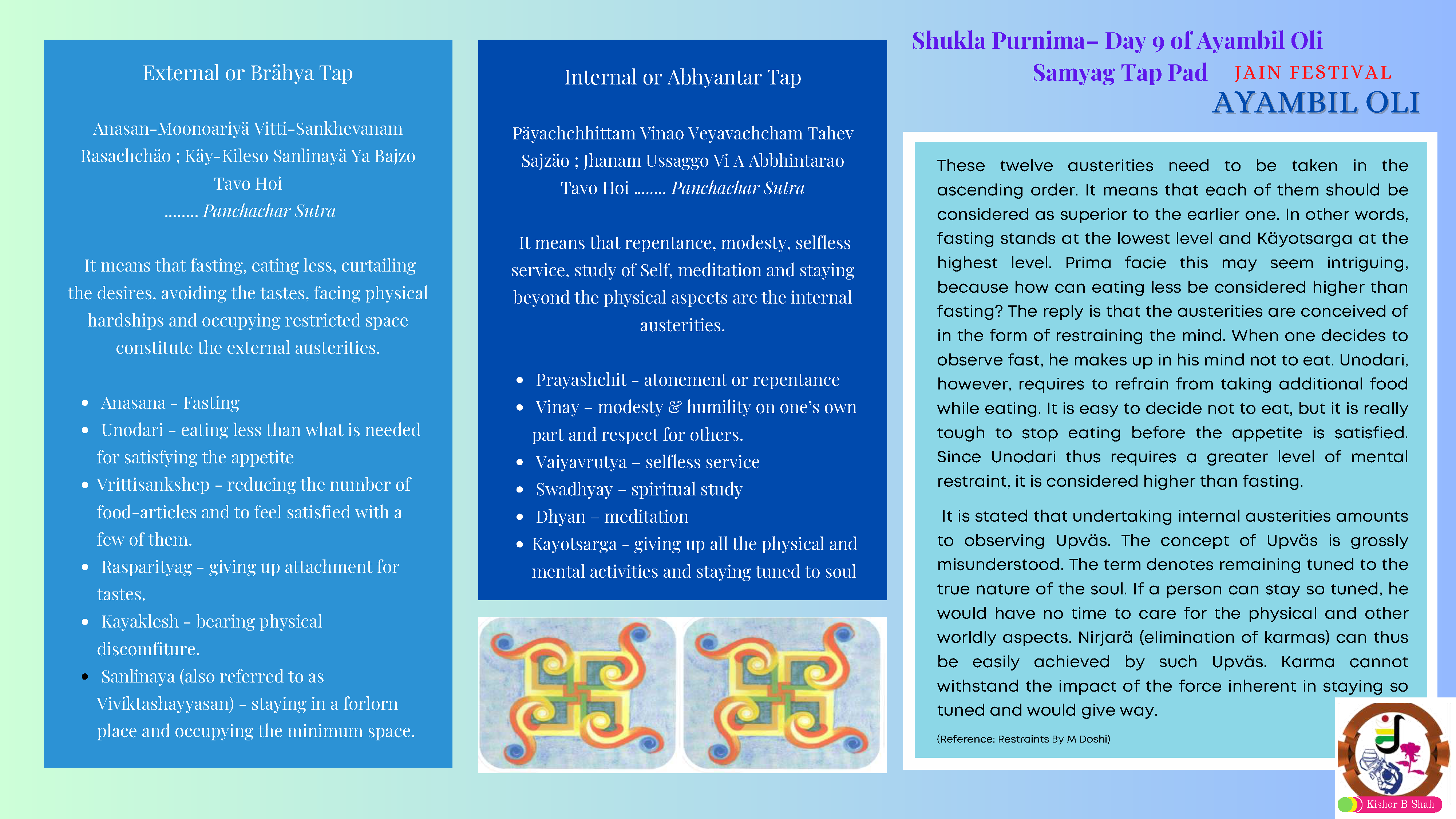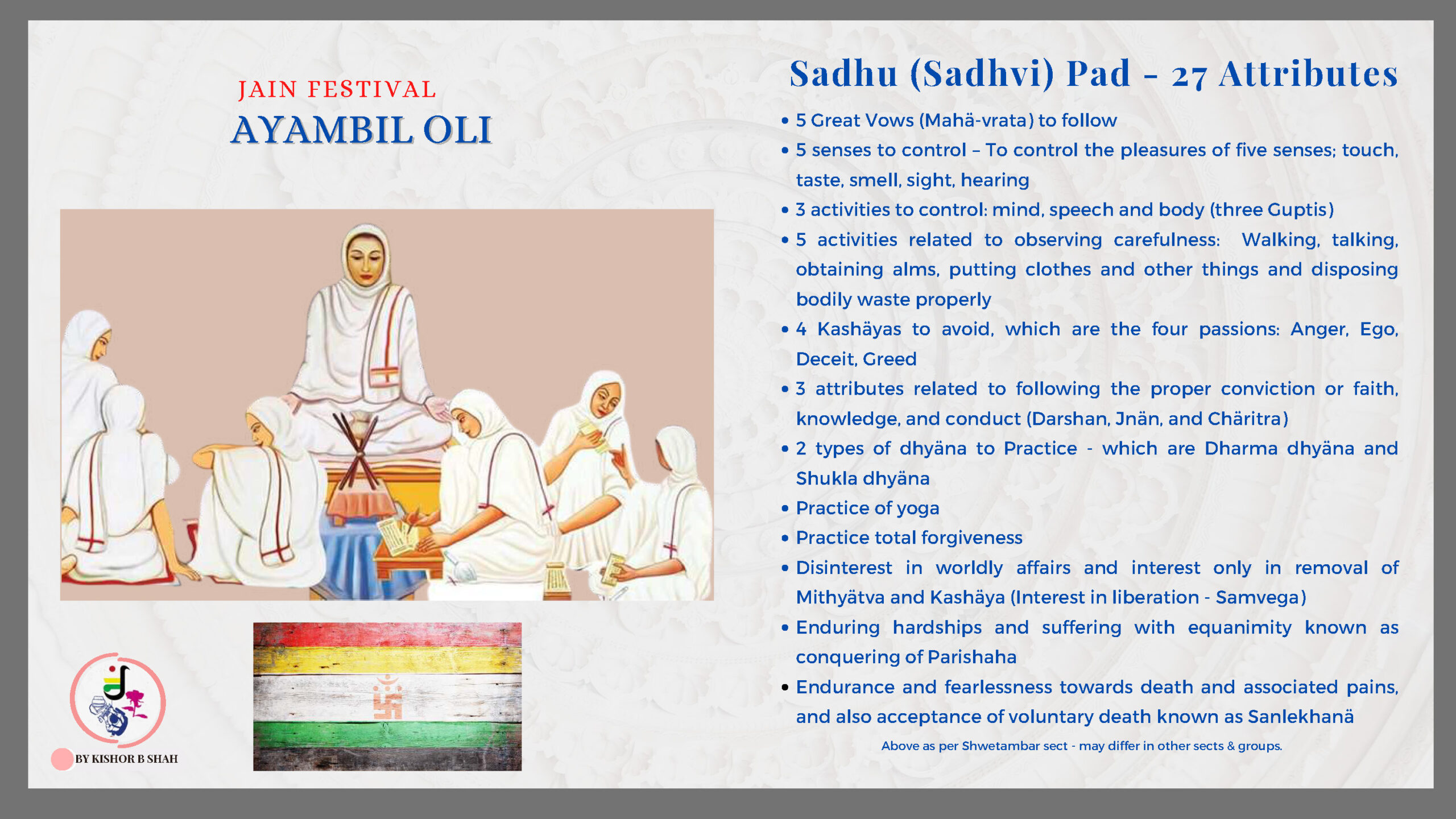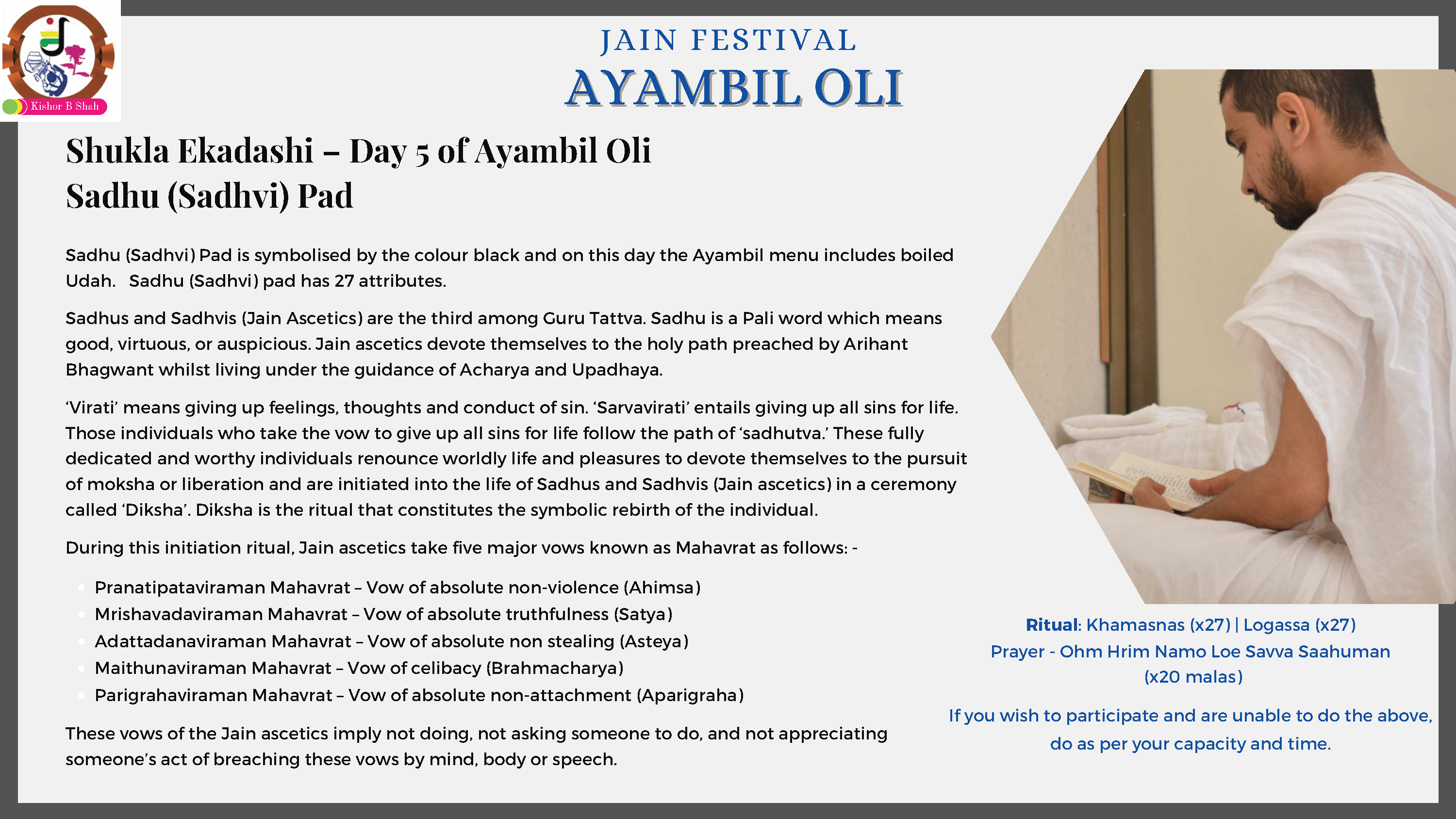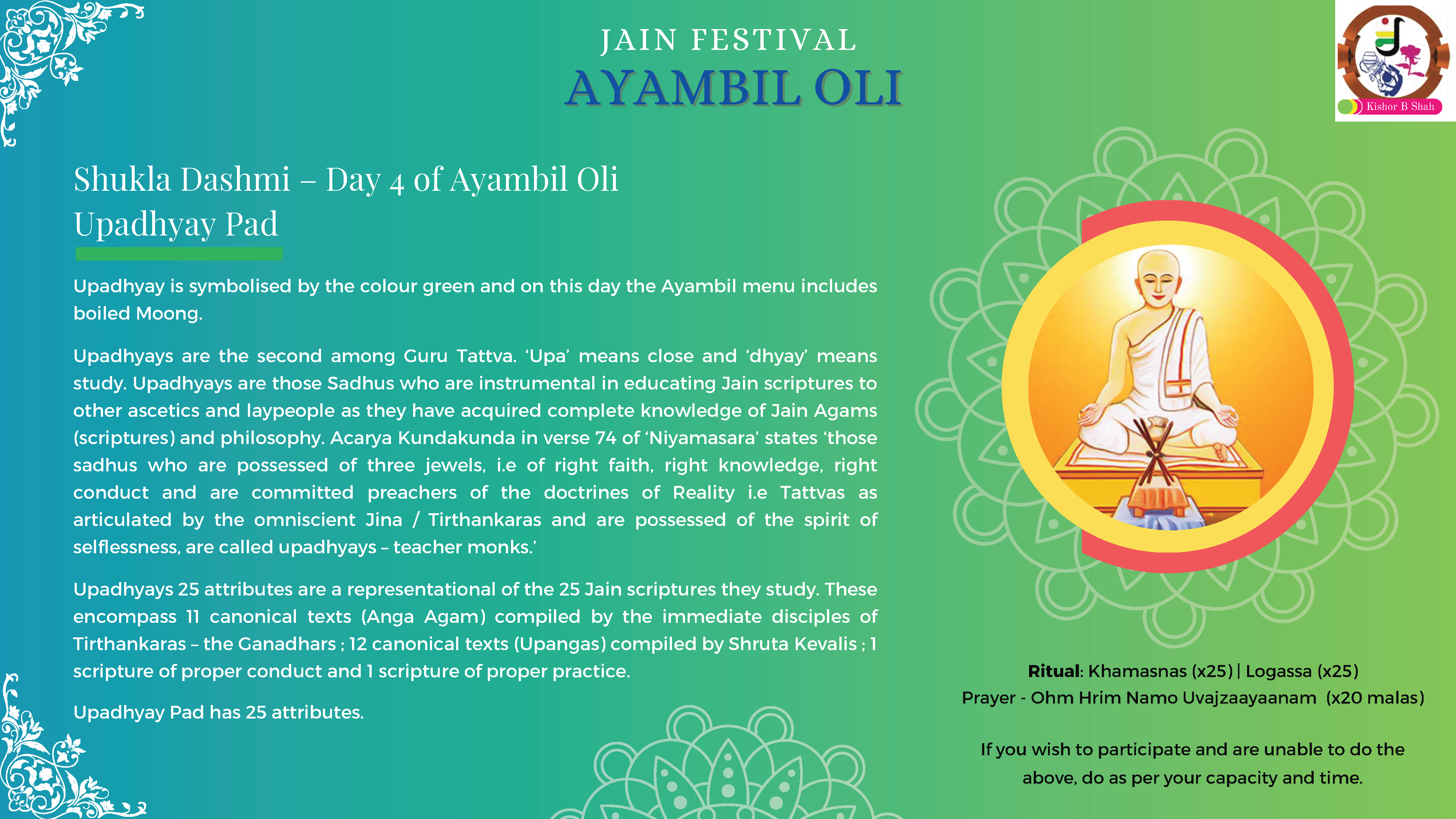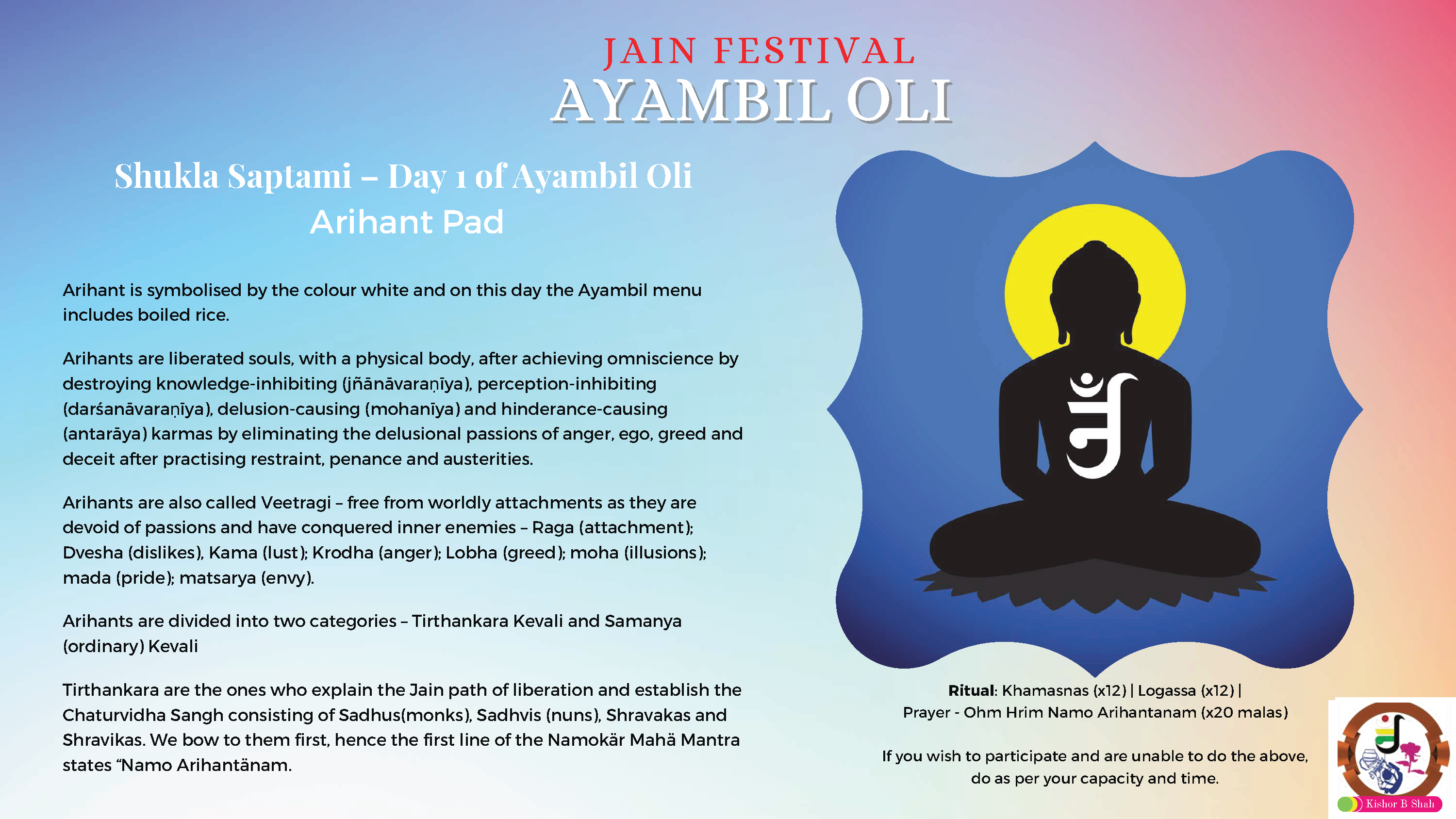 VENUE: Ayambil as always will be taking place at Oshwal Centre each day. There will be vaachan from 11am and thereafter bhojan.