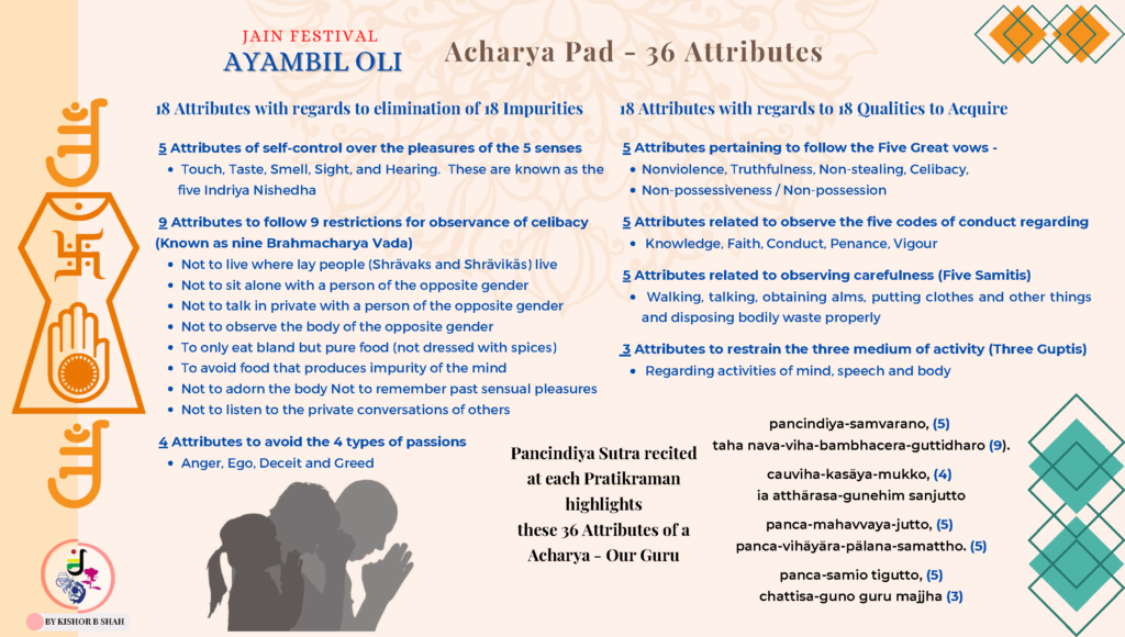 The fast of Ayambil is observed to attain spiritual upliftment through the achievement of victory over the control of TASTE and not FOOD to shed karmic bondage. During this fast vigai tyaag ( refraining ) is observed, as it’s believed these foods change the natural tendencies of body, mind and soul and pervert them. They arouse the 4 passions, namely anger, pride, deceit and greed. Let us all immerse ourselves with devotion for the spiritual upliftment during these 9 days of Shri Aaso Maas Ayambil.