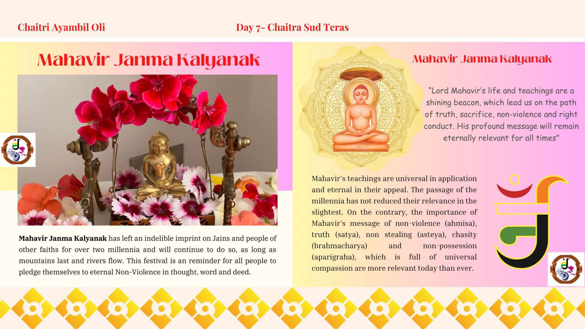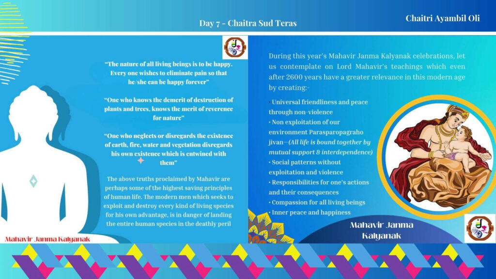 | 7 | Sun, 21st April | 9:00am Shri Mahavir Janma Kalyanak Procession and Mahavir Janma Kalyanak Celebration |