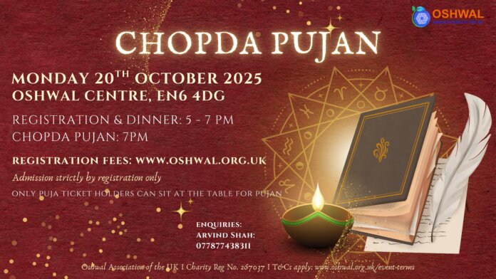 – Chopda Pujan : 7:00 pm (performed in English and Gujarati (Jain Vidhi))