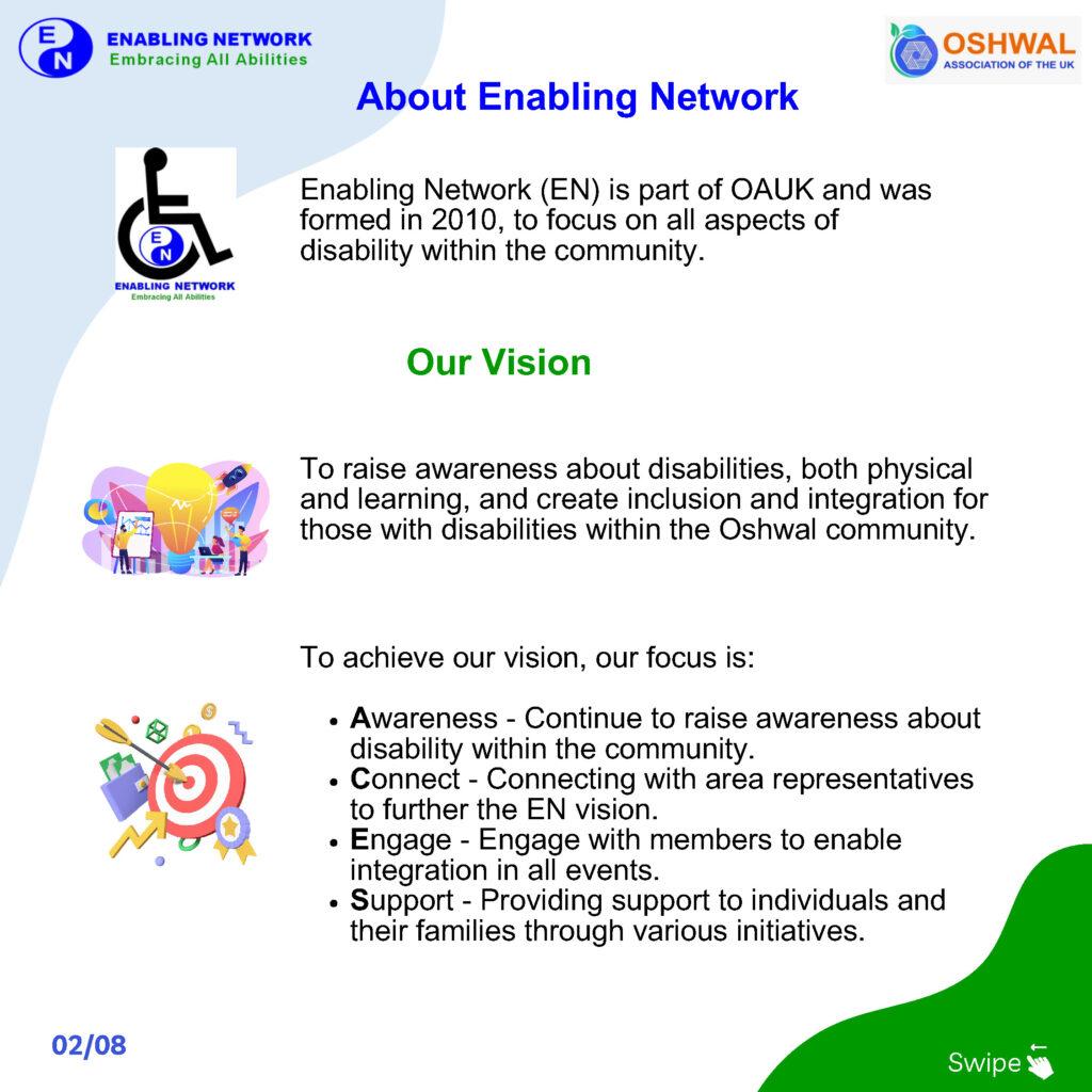 Enabling Network (EN) is part of OAUK and was formed in 2010. EN’s vision is to raise awareness about disabilities, both physical and learning, and create inclusion and integration for those with disabilities within the Oshwal community.