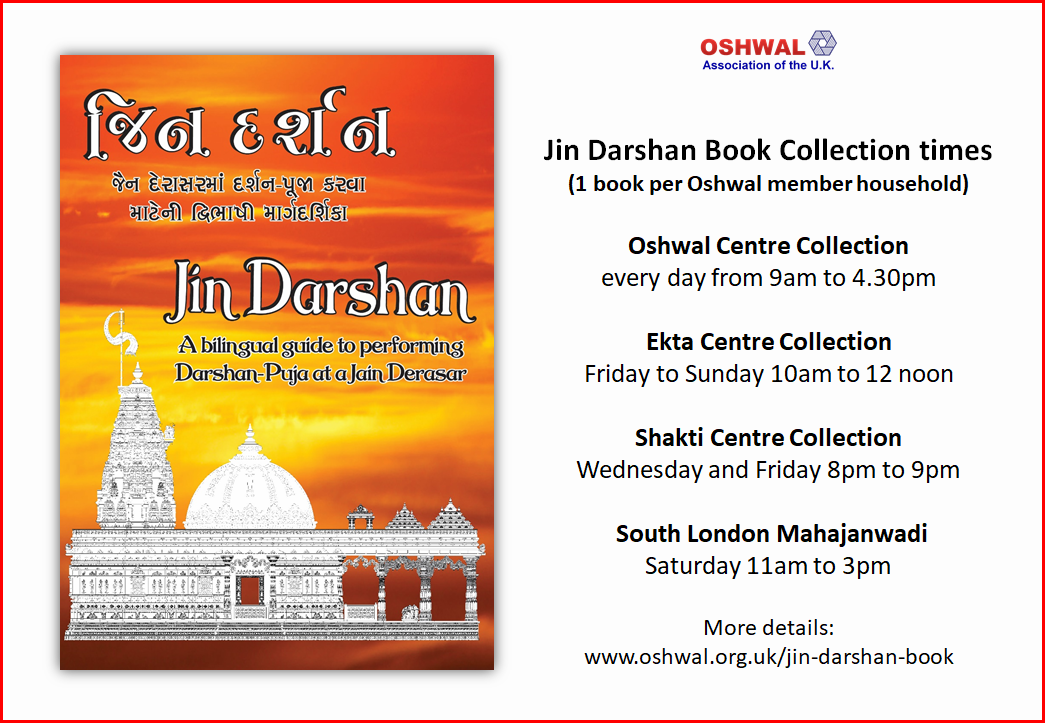 Following the launch of the Jin Darshan book, Oshwal members can collect their copy from our centres at the following times. Please DO NOT come to the centre if you are showing symptoms on COVID-19 and follow all social distancing guidelines when visiting.