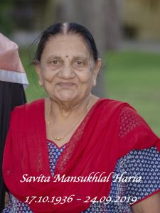 It is with deep sorrow that we announce the death of Mrs Savita Mansukhlal Haria on Tuesday 24 September 2019 in Perth, Western Australia.