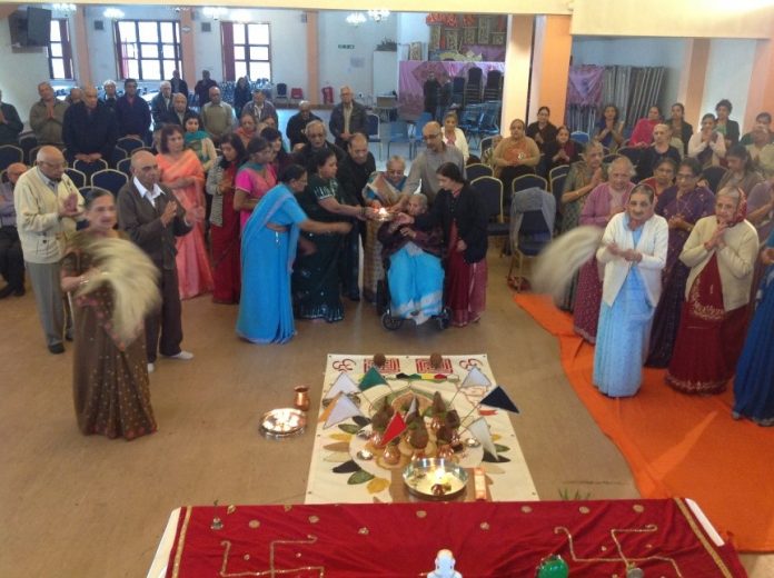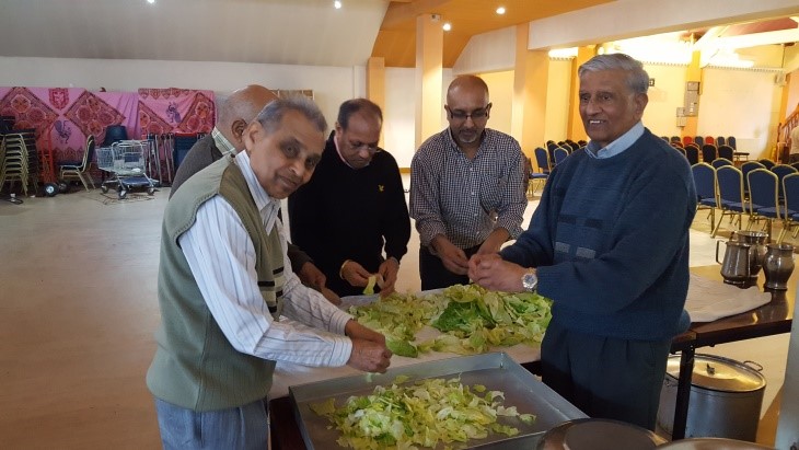 After the recital of prayers, lunch of lapsi, channa nu shaak, salad, daal bhat, far far, dhokri, puri and chaas was served. All waited patiently in orderly queues as the volunteers worked tirelessly warming up and refilling the serving bowls. Approximately 160 guests from Leicester, London and Birmingham caught up with each other in a jovial atmosphere over the luncheon.