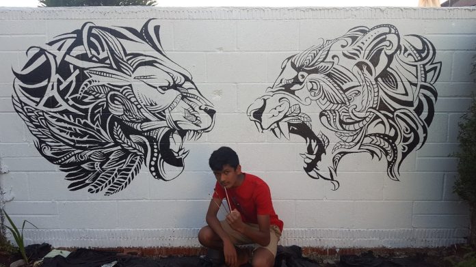 Liam said: ”I wanted something to do during lockdown and I wanted to spend time in the nice hot weather, so I decided to paint the plain walls in my back garden…During the first lockdown, I drew and painted Lord Ganesh and two Lions. I had to use black and white paint as there were not any exterior-coloured paints available at that time.”
