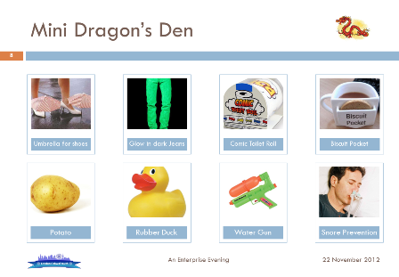 After the presentations, all participants were split into 8 teams and took part in a mini Dragons Den business game, with a view of making a winning pitch for some wacky products to the Enterprise Programme students, who were the Dragons for the evening. The resulting sales pitches were truly inspirational and hilarious. The eventual winners were Team 1 who successfully sold the idea of Umbrellas for Shoes to the Dragons. Other products included: glow in the dark jeans, comic toilet roll, biscuit holder for tea cups, potato, rubber duck, water gun, snore prevention equipment.