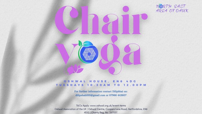 Chair Yoga takes place every Tuesday at Oshwal House from 10:30am to 12 noon. The classes are now conducted by Dilipbhai Shah.