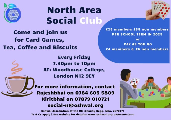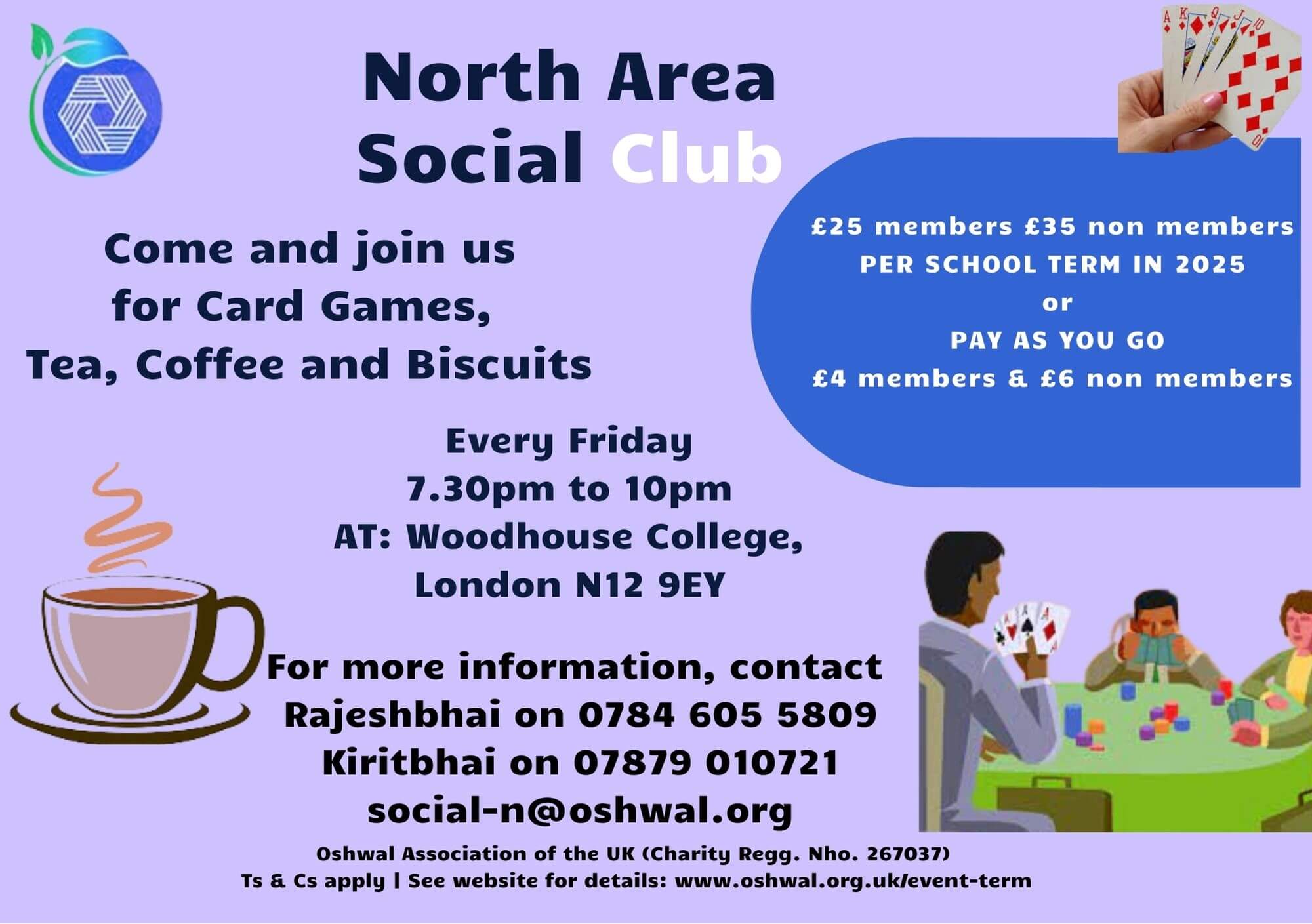 North – Social Club FRIDAY SOCIAL CLUB Woodhouse College – Foyer 7.30 – 10.30 pm Socialise with friends playing a range of table top games. For more information contact Kirit / Rajesh: social-n@oshwal.org