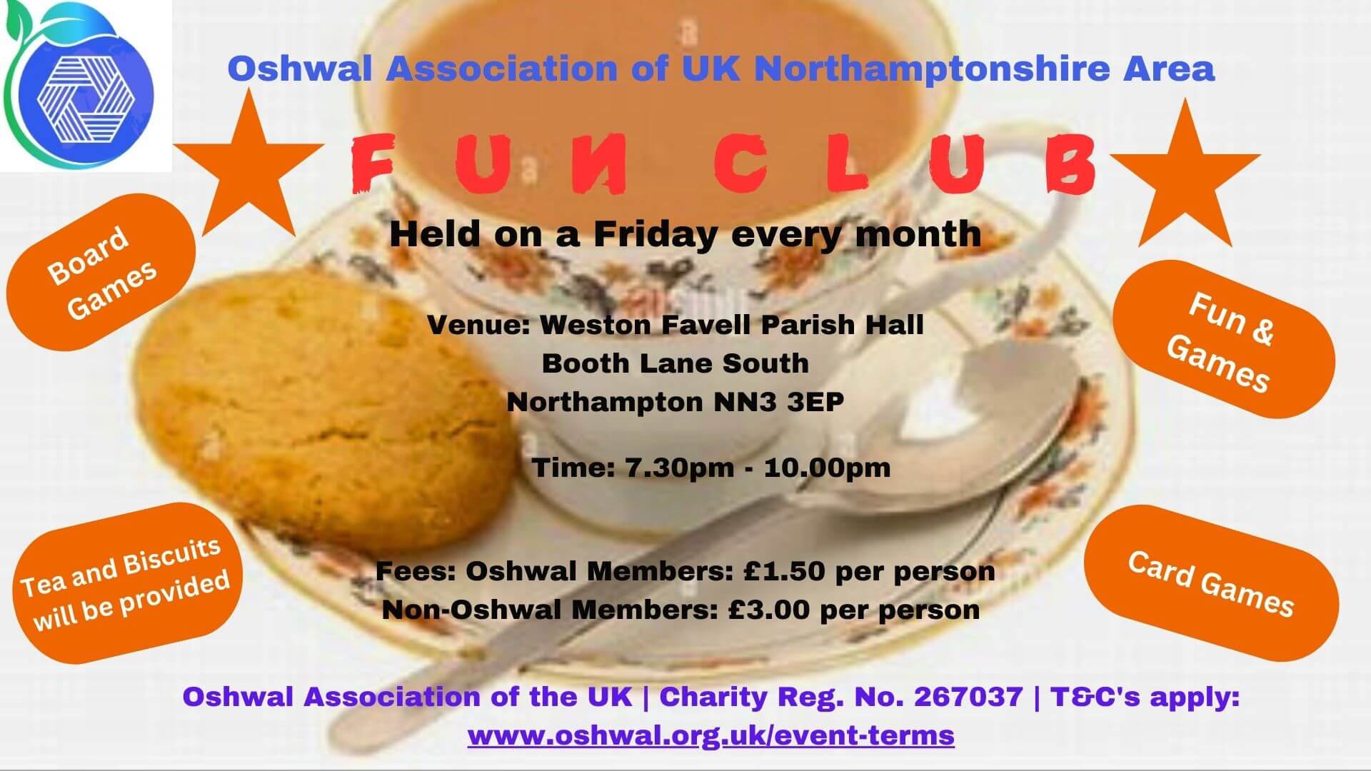 Northants – FunClub Date: Monthly Friday’s Time: 7.30pm to 10.00pm £Price Oshwal Members: £1.50 per person Non-Oshwal Members: £3.00 per person For more information please contact: Kumudh on 07738711631 via whatsapp message only