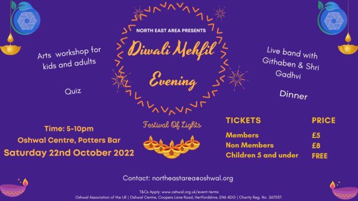 North East Area present to you a Diwali Mehfil held on 22nd October 2022 from 5pm to 10pm at Oshwal Centre, Potters Bar.