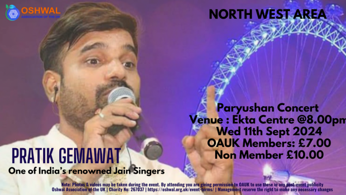 Renowned Singer from India, Pratik Gemawat will be performing live at Ekta Centre, a selections of Stavans, Bhajans and many other songs in his unique style.