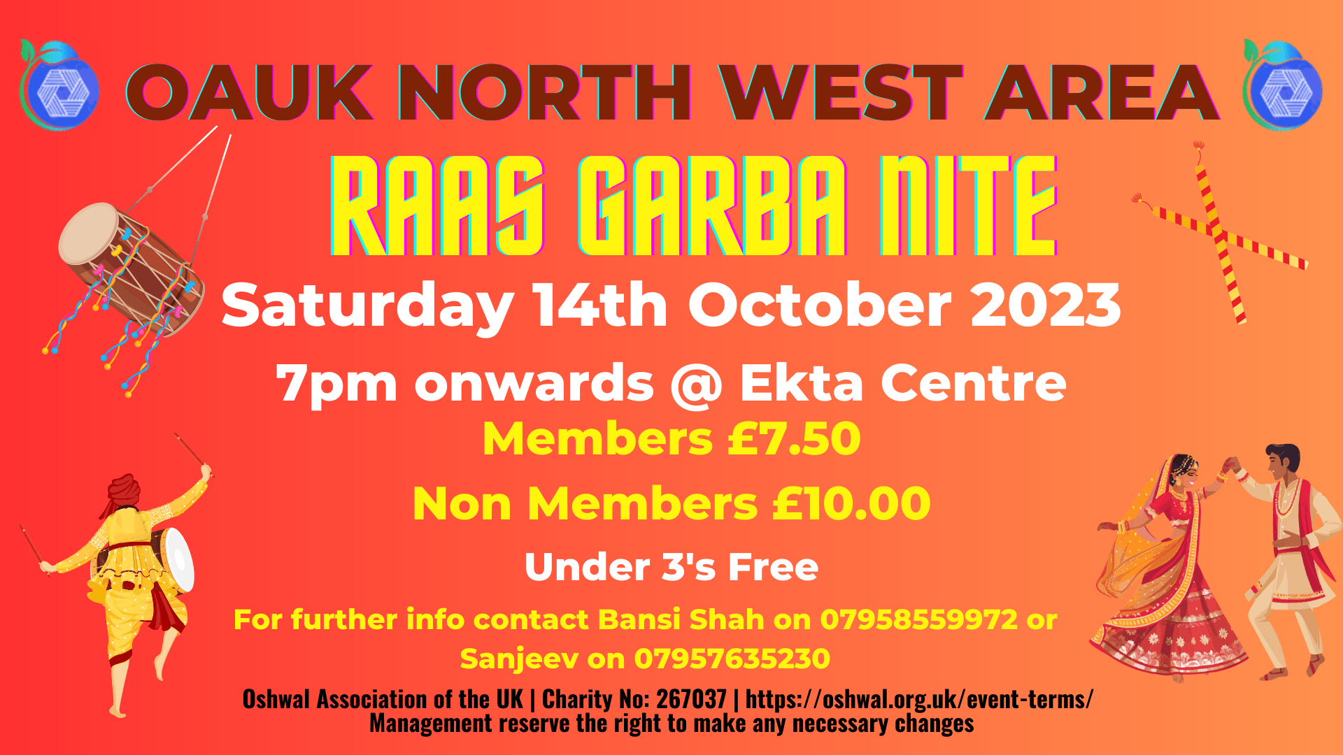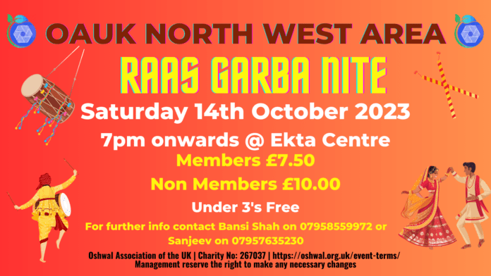 North West Area – Raas Garba Location: Ekta Centre, 366a Stag Lane, NW9 9AA Date: Saturday 14th October 2023 Time: 7:00pm till 11:00pm Live Music by Rajveeben Punatar Shah & Parasbhai Please bring your own dandiyas Food and drinks will be available for purchase