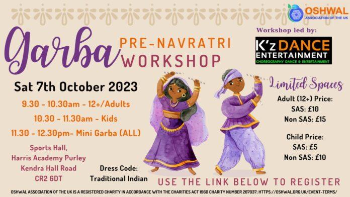 We are hosting a Garba Workshop for all prior to Navratri. Come along and join in with the fun and improve your garba moves. This workshop is taking place on Saturday 7th of October 2023 at Harris Academy Purley. The workshop will begin with an Adults (12+) session for the first hour, followed by a session for the under 12’s and then a mini garba for all participants. The workshop is being hosted by KZ entertainment and it will be run by a professional Garba teacher/choreographer who will be teaching you all the moves you need to know to be ready for Navratri. Dress code – Indian Traditional. Prices are discounted for South SAS members. Please see the poster or link for more information.