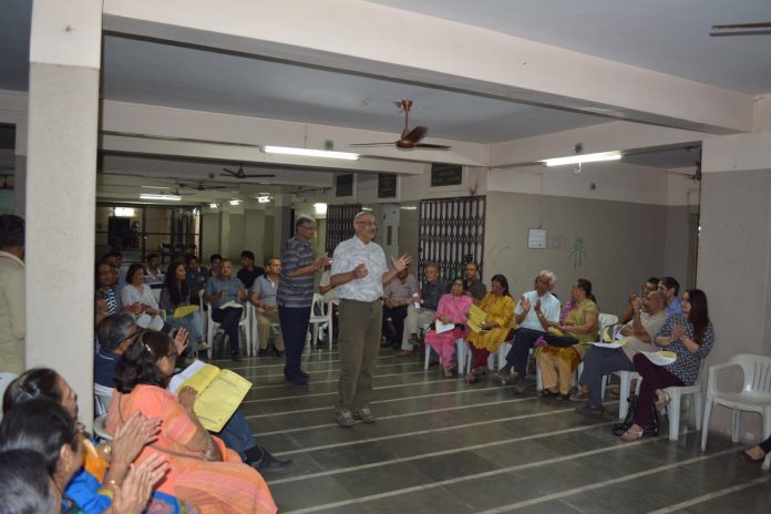 On a warm evening, at Oshwal Centre in Jamnagar, Gujarat, India, Tusharbhai (OAUK President) and Ashokbhai (OAUK Trustee) lead a volunteer briefing for volunteers from India and UK, who have all come together for the Oshwal Medical Camp, which starts on Friday 9th Feb 2018.