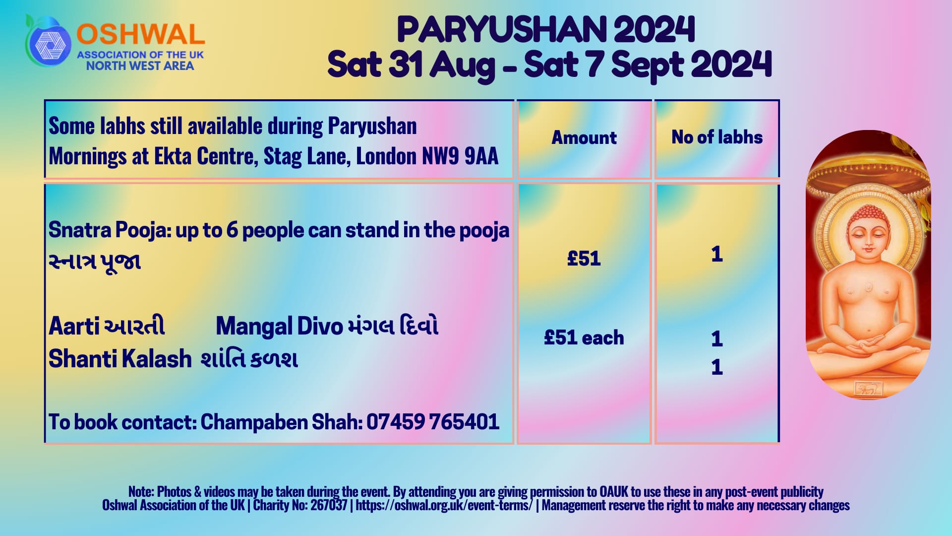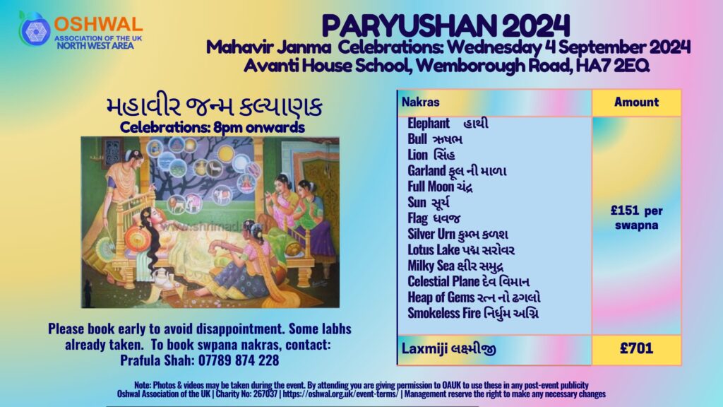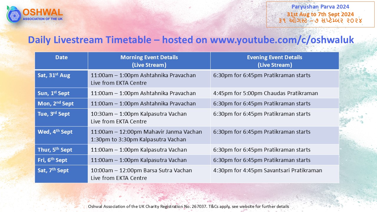 We are working in collaboration with Oshwal Association of the UK. The dates and timings are in the enclosed poster.
