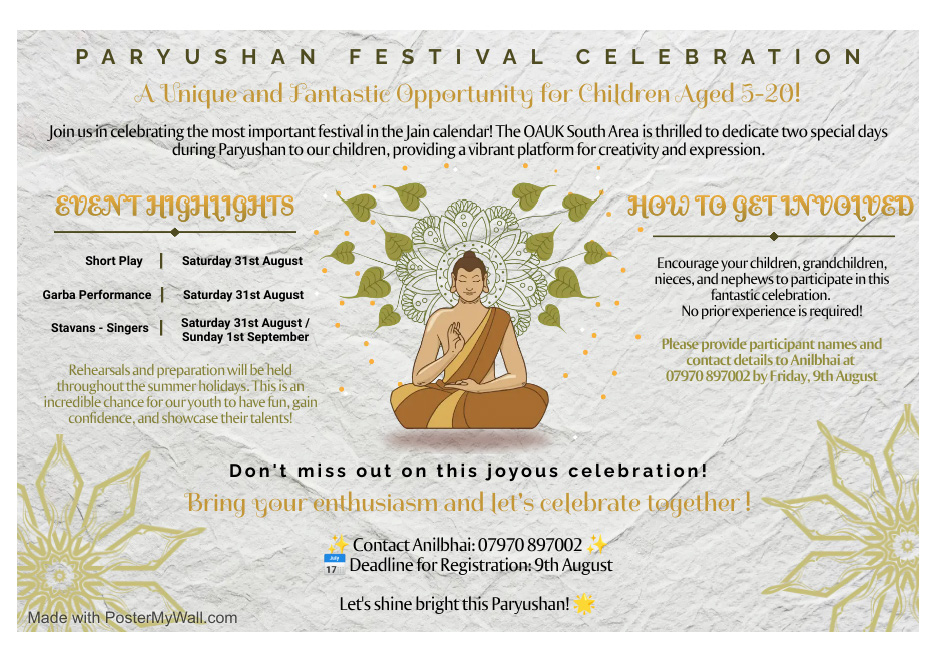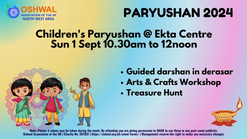 OAUK South Area will be dedicating first 2 days of festivities this Paryushan as children’s day’s. We invite all families to bring their children and involve them in this important festival.