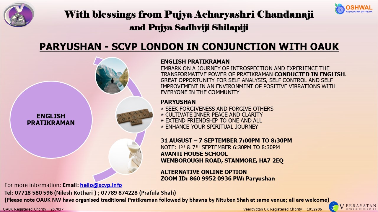 SCVP London (part of Veerayatan UK) is pleased to inform you that this year again during Paryushan, we have organised Pratikraman in English for all 8 days and will be conducting it in person at Avanti House School in Stanmore. The sutras will be recited in English as well as the original language and with appropriate explanations with the primary objective being to unlock our compassion and positivity.