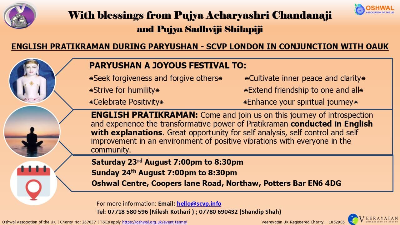 SCVP London (part of Veerayatan UK) is pleased to inform you that this year again during Paryushan, we have organised Pratikraman in English for all 8 days and will be conducting it in person at Avanti House School in Stanmore. The sutras will be recited in English as well as the original language and with appropriate explanations with the primary objective being to unlock our compassion and positivity.
