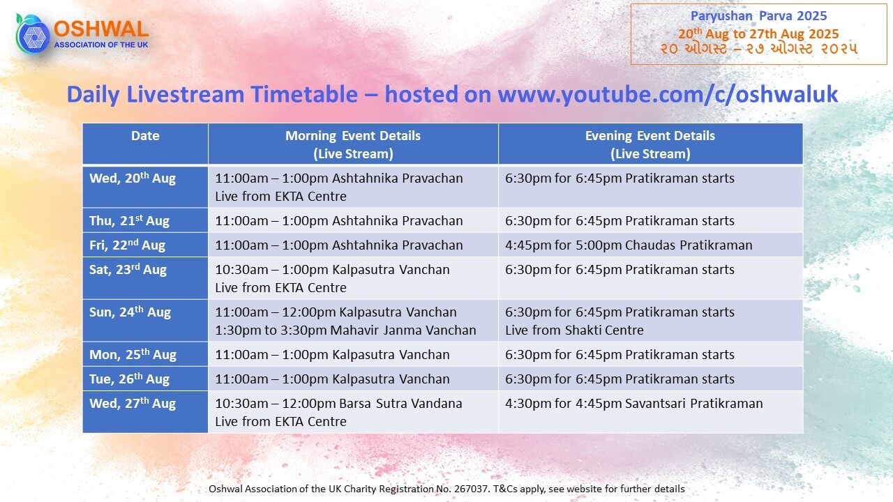 Pranam and Jai Jinendra. We hope you are all well. Paryushan will be conducted both in person (for all areas) and virtual. All are warmly invited to participate everyday. Please find links below for activities taking place at various OAUK Areas.