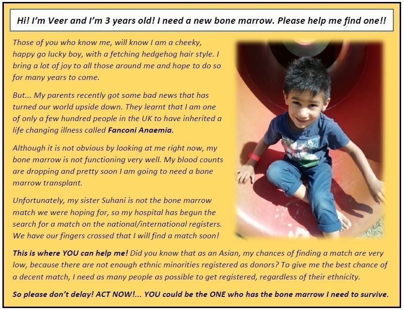 This message is in relation to our son Veer. As you can see, he needs your help, both for registering as donors, and spreading this message far and wide.
